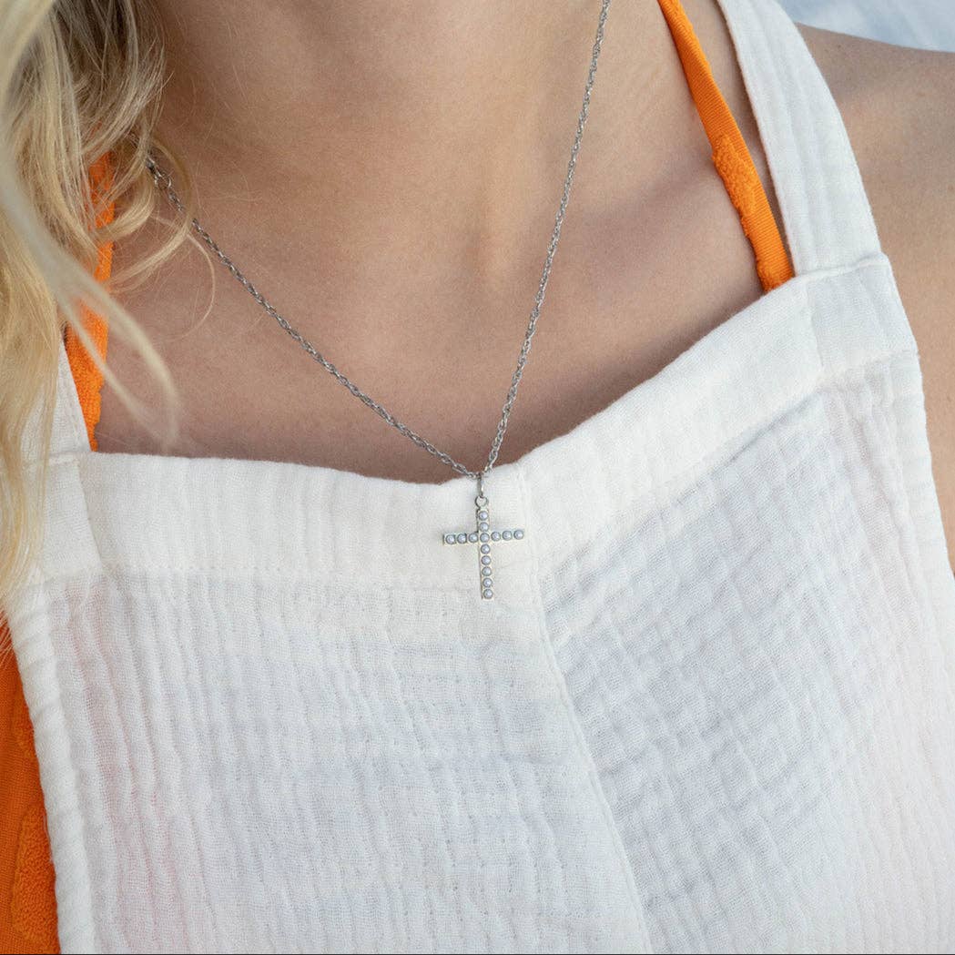 18K Gold PVD Stainless Steel Pearl Beaded Cross Charm: Stainless / 15mm