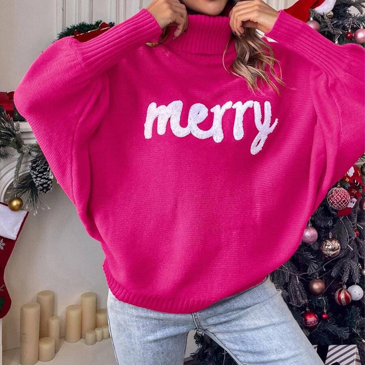 BAT-SLEEVED TURTLENECK SOLID COLOR KNIT SWEATER