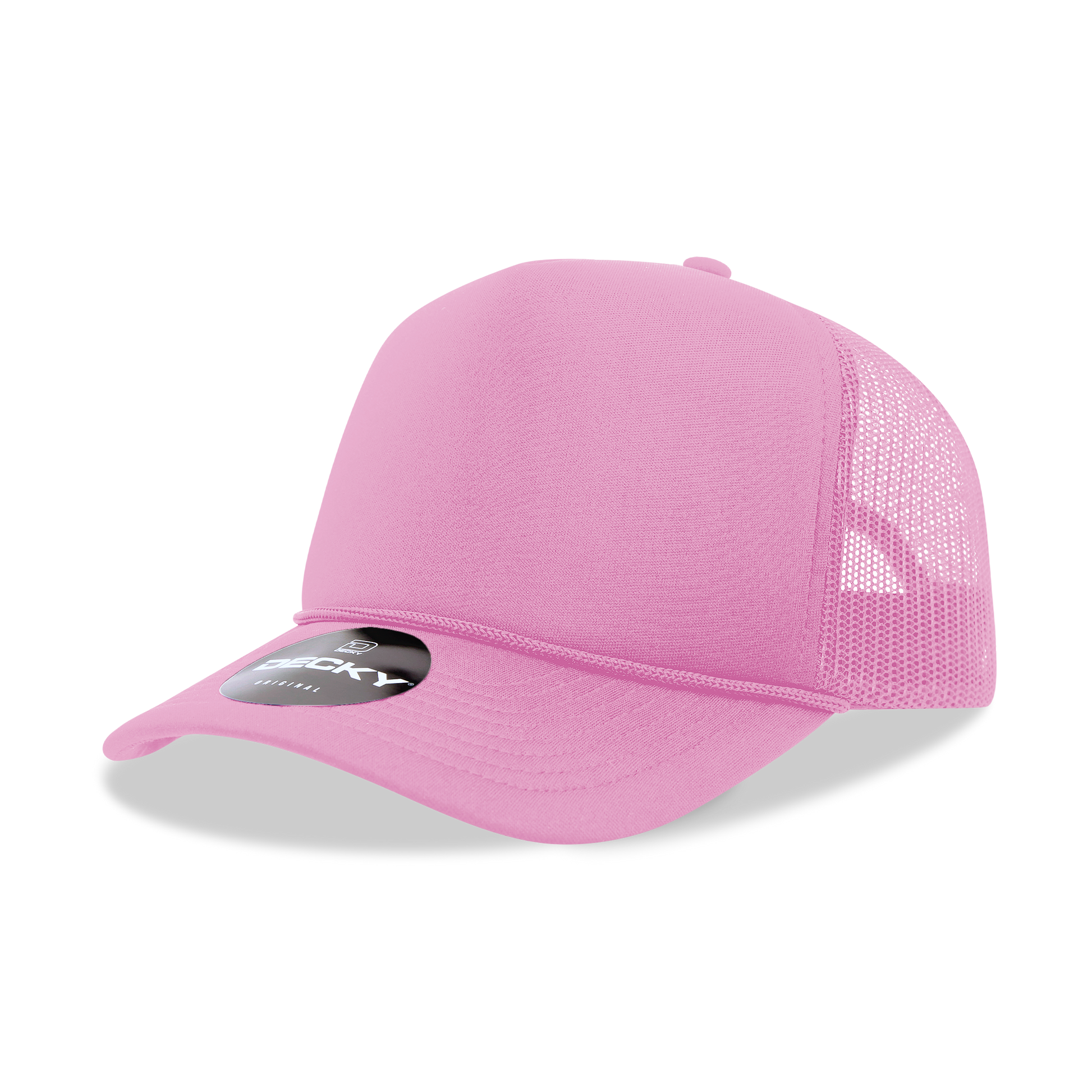 The Decky 6025 - Mid Profile, 5 Panel Foam Trucker Hat is constructed with rear mesh panels and a foam front. It features an integrated cotton sweatband, a pre-curved bill, and an adjustable plastic snap closure.