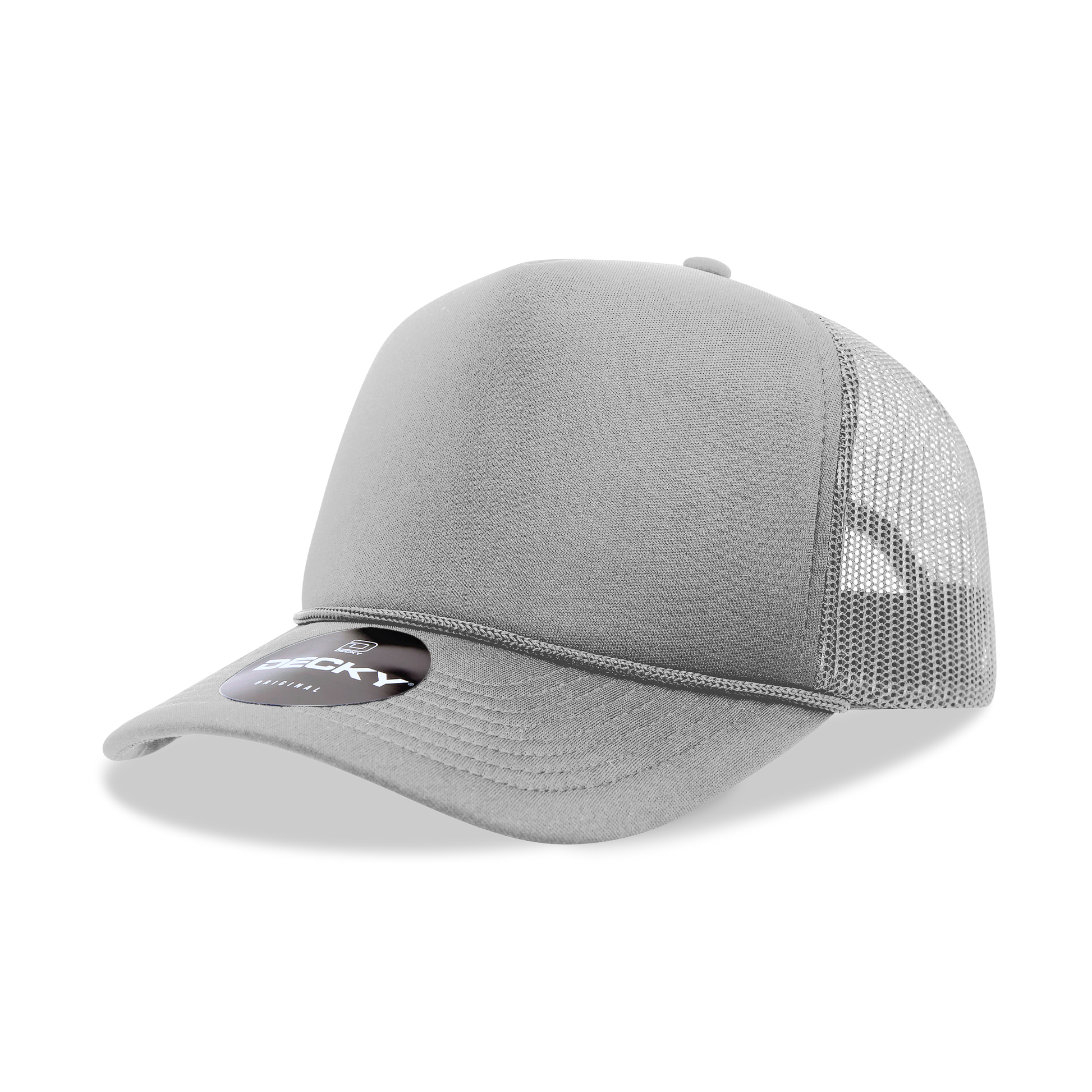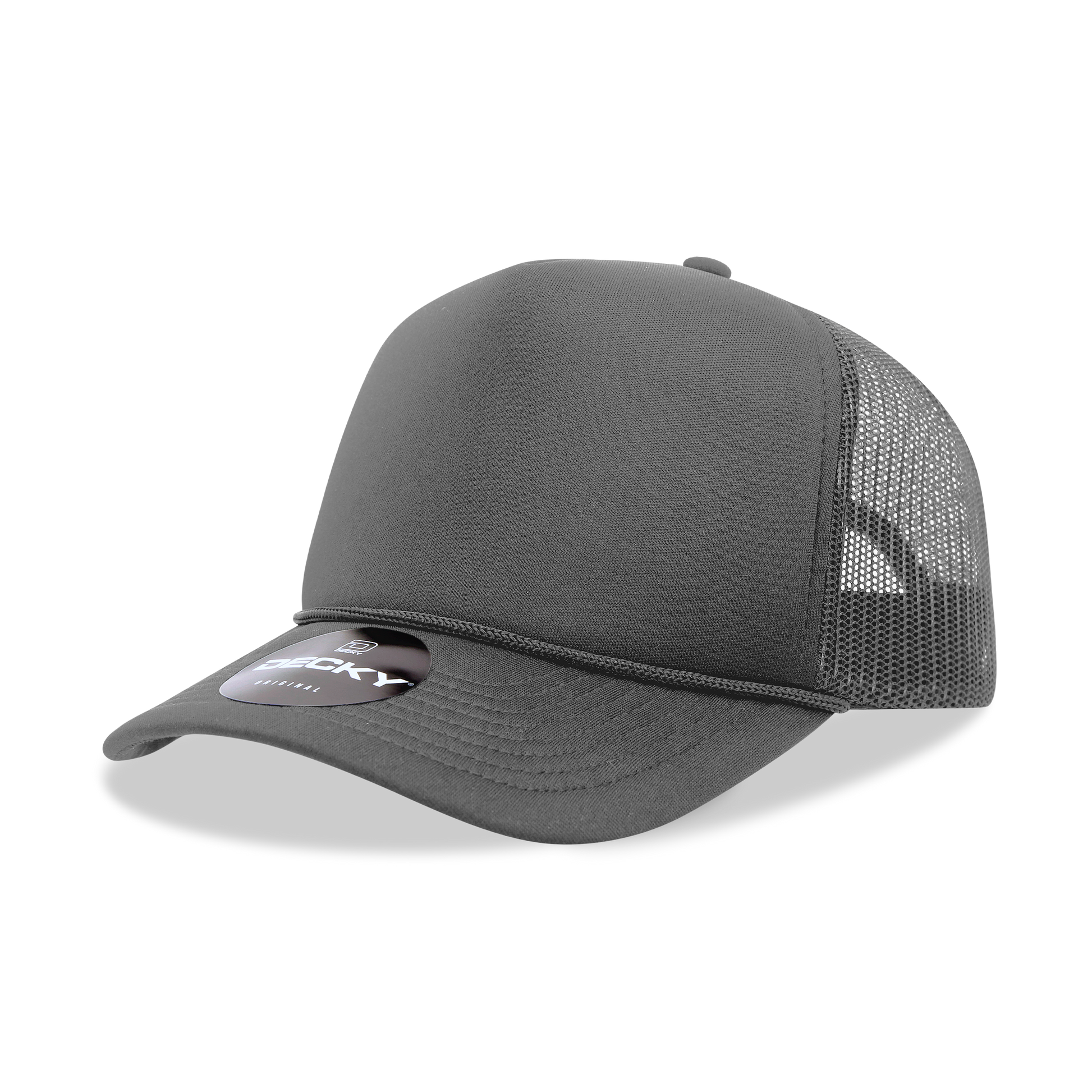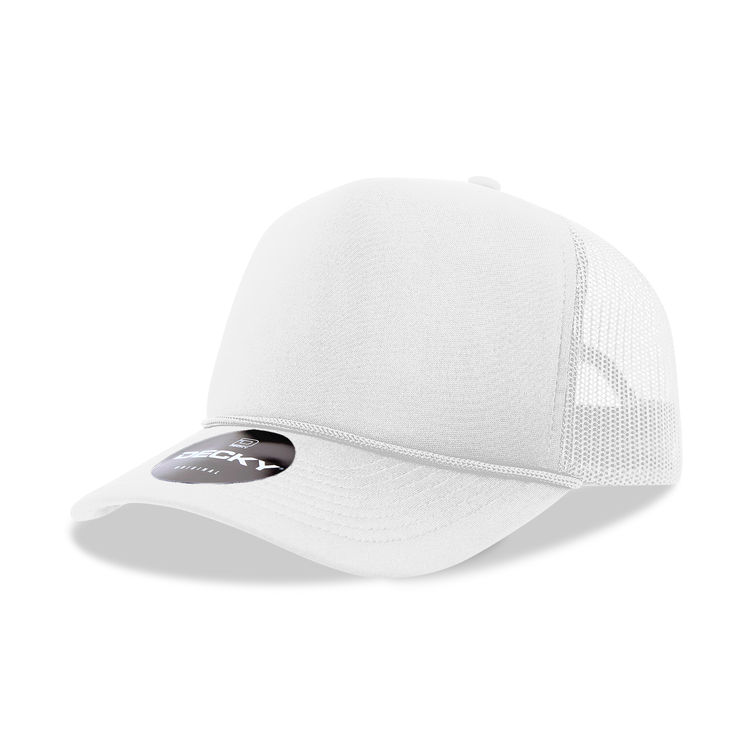 The Decky 6025 - Mid Profile, 5 Panel Foam Trucker Hat is constructed with rear mesh panels and a foam front. It features an integrated cotton sweatband, a pre-curved bill, and an adjustable plastic snap closure.