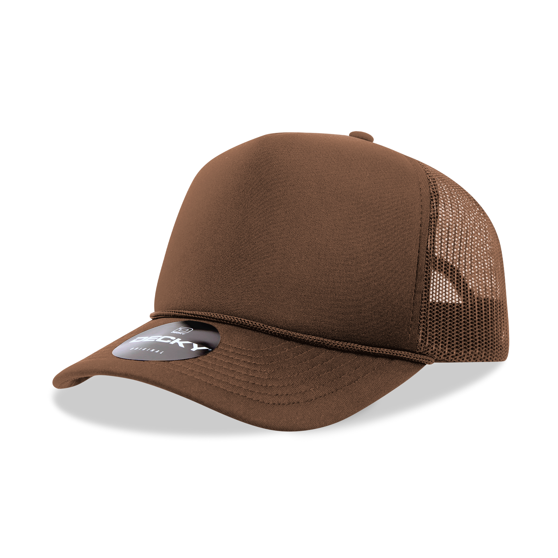 The Decky 6025 - Mid Profile, 5 Panel Foam Trucker Hat is constructed with rear mesh panels and a foam front. It features an integrated cotton sweatband, a pre-curved bill, and an adjustable plastic snap closure.