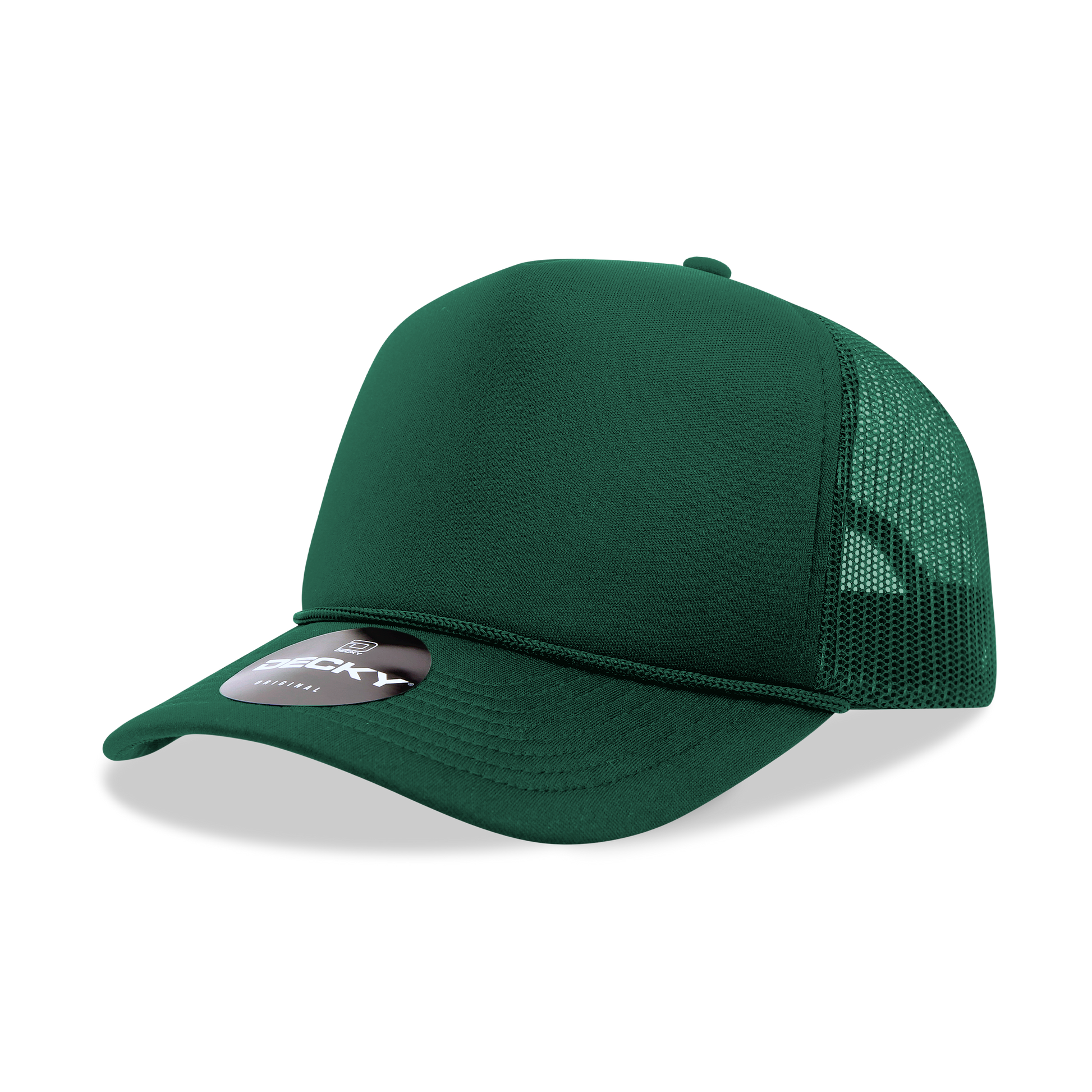 The Decky 6025 - Mid Profile, 5 Panel Foam Trucker Hat is constructed with rear mesh panels and a foam front. It features an integrated cotton sweatband, a pre-curved bill, and an adjustable plastic snap closure.