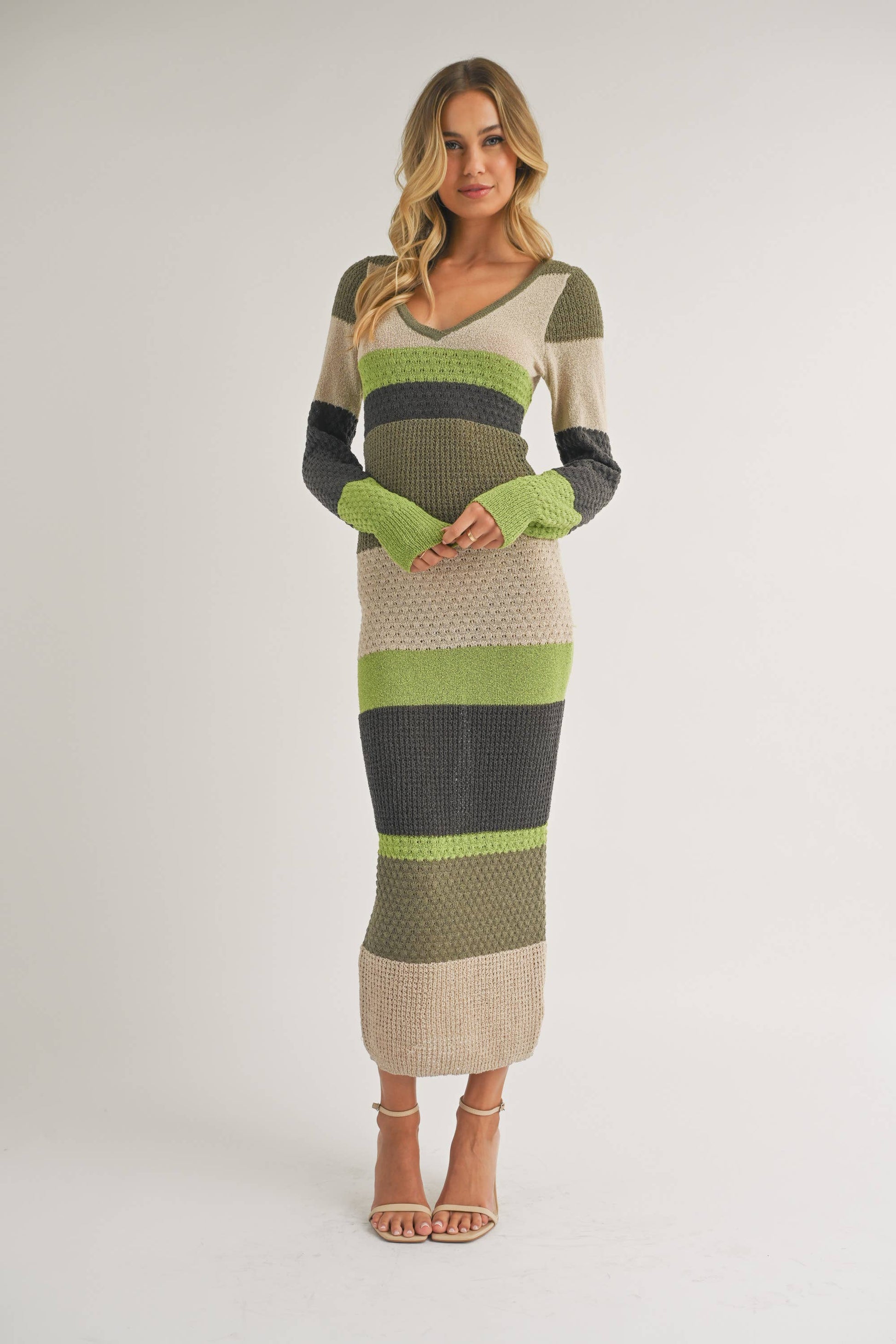 ID7261 - LONG SLEEVE COLORBLOCK SWEATER BODYCON MIDI DRESS: BROWN MULTI / M