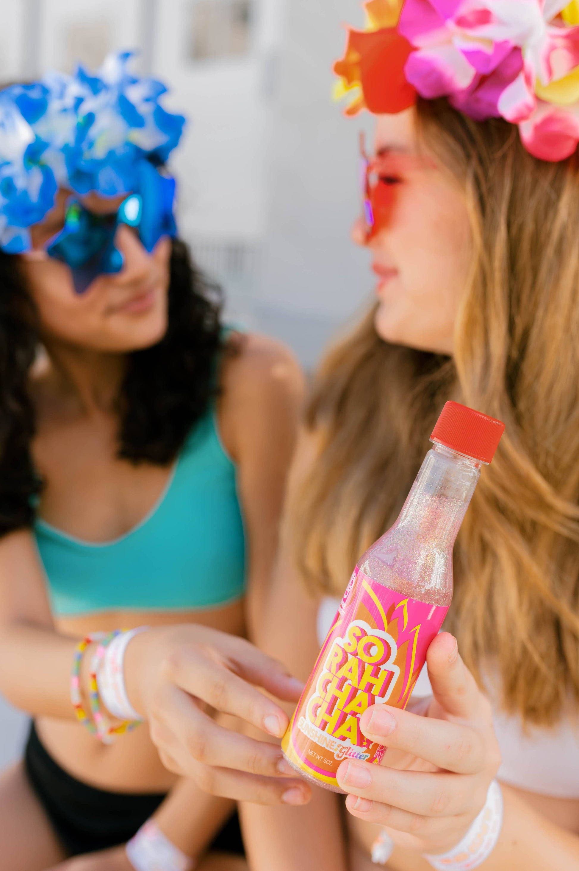 SoRahChaCha biodegradable glitter aloe gel is here for the party! You'll be dazzling and radiant while caring for, cooling and hydrating your skin. Reminiscent of the iconic sriracha sauce, SoRahChaCha brings the fire with iridescent rose gold biodegradable glitter while soothing your skin with aloe. Fabulous for festivals, concerts, school dances/prom, parties, vacation/travel, Halloween costume parties or everyday glam and sparkle.