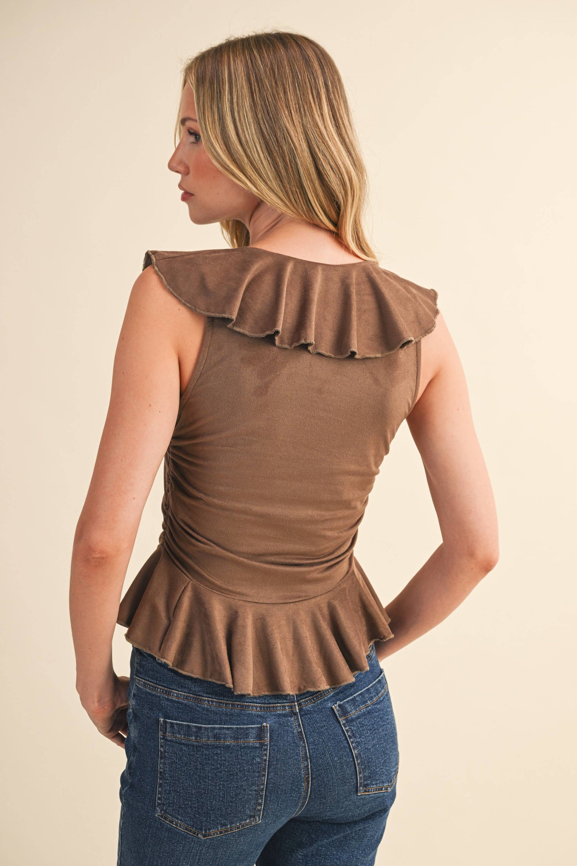 T4378-A SLEEVELESS RUFFLED NECK TIE FRONT PEPLUM TOP: OLIVE / S